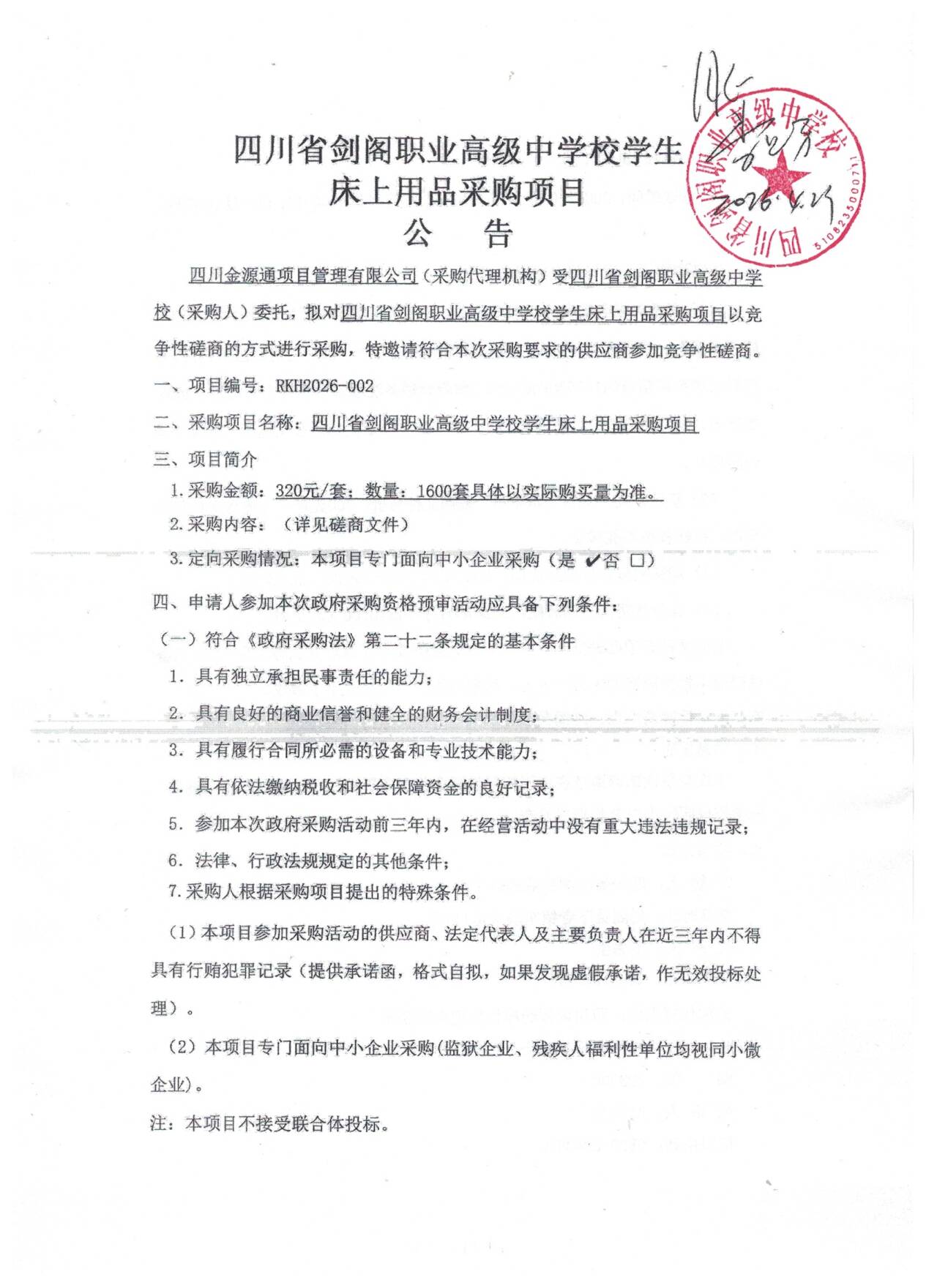 四川省剑阁职业高级中学校学生床上用品采购项目公告